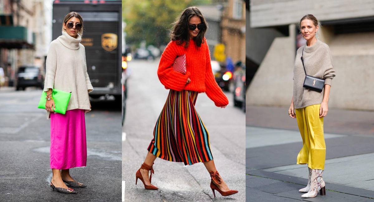 Яркий гардероб - беспроигрышный вариант, чтобы противостоять осенней хандре. Одеваясь на работу или на прогулку, не обязательно ориентироваться на палитру серых улиц и мимикрировать под хмурое небо, гораздо лучше создать настроение с помощью ярких сочетаний. Герои стритстайл-хроник уже уяснили это правило и легко совмещают в одном образе главный предмет осеннего гардероба - свитер - с насыщенными платьями, юбками и брюками.