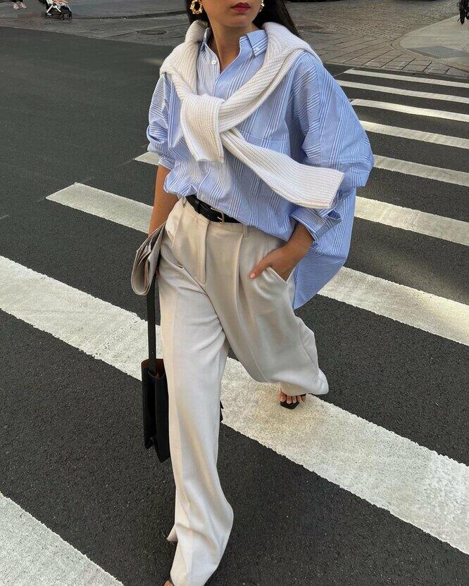 Белые брюки давно стали незаменимой униформой на летний сезон. Носить их можно буквально везде: от офиса до свидания, от жаркой вечеринки в центре города до морского побережья. Универсальная пара из тонко ткани легко подойдет к любой одежде: брюки легко комбинируются с майками, футболками, блузами и рубашками. Однако именно с последними белые брюки особенно полюбили носить инфлюенсеры. Причем не с любыми рубашками, а обязательно голубого цвета. Рассказываем, почему это комбо - идеально для лета.
