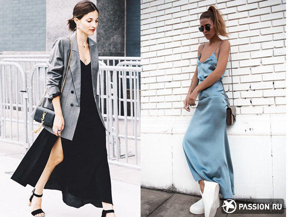 Бельевой шик пришелся по душе сегодняшним фэшенистам. Топ с кружевом легко носить с джинсами днем и с жакетом вечером. Во время прогулки по городу платье-комбинацию можно легко прикрыть джинсовой курткой, а вечером накинуть на него элегантный жакет или длинный тонкий черный кардиган. В роли верхней одежды также может выступить кожаная куртка. Топы и платья на тонких бретелях всегда можно надеть на футболку, рубашку или обтягивающую кофту и создать интересный многослойный образ в духе 90-х. Эти вещи выглядят модно как с обувью на каблуке, так и с плоской невысокой платформой. К топу лучше подобрать актуальные длинные серьги, а к платью надеть чокер из черной ленты или металла.