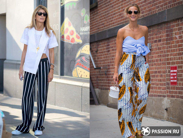 С принтом или без - решать вам. В этом сезоне модно носить даже самые пестрые расцветки. Мягкие натуральные ткани очень подвижные и приятные для тела. К однотонным брюкам лучше всего подобрать топ насыщенного или нейтрального оттенка, цветочный принт или рисунок в полоску. Нарядные многоцветные брюки лучше сочетать с нейтральными и пастельными оттенками. Добавьте сет из крупных браслетов, стильный чокер или часы, чтобы выглядеть стильно.