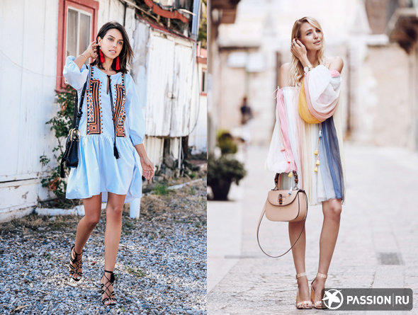 Свободное платье длиной не ниже колена или отрезное по талии платье макси - то что нужно, чтобы выглядеть шикарно. Обильная вышивка, кисти, рюши, цветочные принты или пышные рукава - характерные черты такого наряда. В этом сезоне огромное разнообразие цветовых решений - от однотонных до самых контрастных. Обязательно добавьте характерные аксессуары вроде браслетов и колец из натуральных материалов, кожаной сумки с бахромой и крупных солнцезащитных очков. Обувь на танкетке, на толстом каблуке или платформе станет идеальным завершением образа.