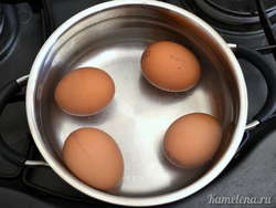 Яйца сварить (варить 10 минут после закипания). Охладить, залив холодной водой.