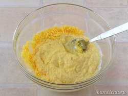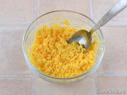 Почистить яйца (понадобятся только желтки). Хорошо растереть желтки в мелкую крошку.