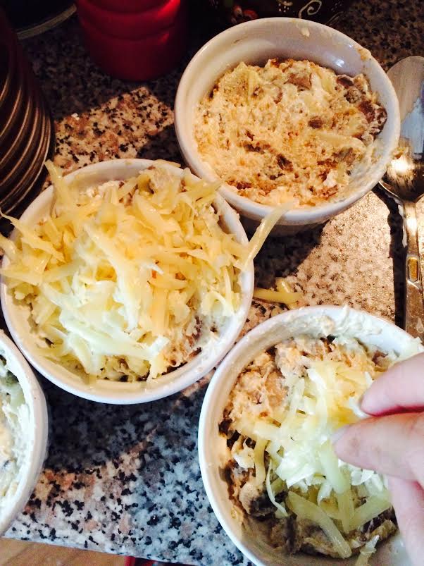 Выключить газ и вмешать в грибную смесь сметану. Эту массу распределяем по порционным формочкам и присыпаем сверху оставшимся сыром.