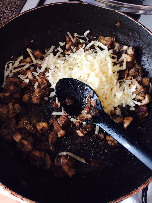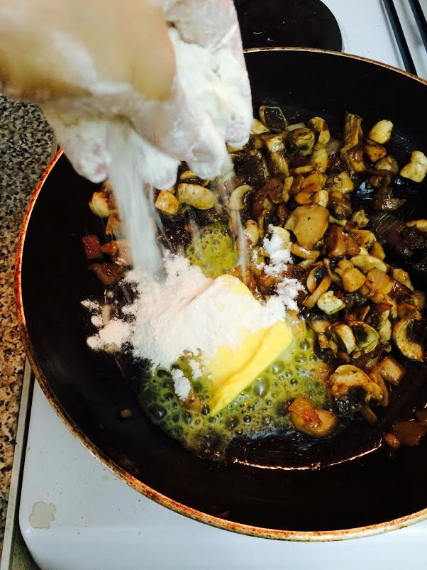 Когда все хорошенько прожарится, добавить сливочное масло, муку и половину натертого сыра, и перемешать.