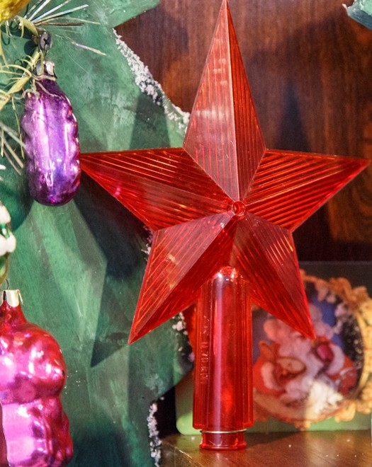 Увлечение Никиты Хрущева сельскохозяйственной темой коснулось даже елочных игрушек! Кукуруза, горох и огурцы не только активно зрели на полях страны, но и расцветали на новогодних елках, иллюстрируя достижения пятилеток. Их делали из стекла и композита - деревянной смеси, пропитанной бетоном. В 50-е годы стали активно выдувать стекло. Появились стеклянные гирлянды и звезды, венчавшие макушки елок. Дореволюционные звезды напоминали о шестиконечной Вифлеемской звезде. А украшения 50-х олицетворяли, конечно же, рубиновые кремлевские звезды с пятью лучами. К перестроечным 80-м годам лучики стали немного вытягиваться, как у старинных рождественских звезд. Кроме того, к ним начали проводить электричество, чтобы они зажигались вместе с гирляндами.