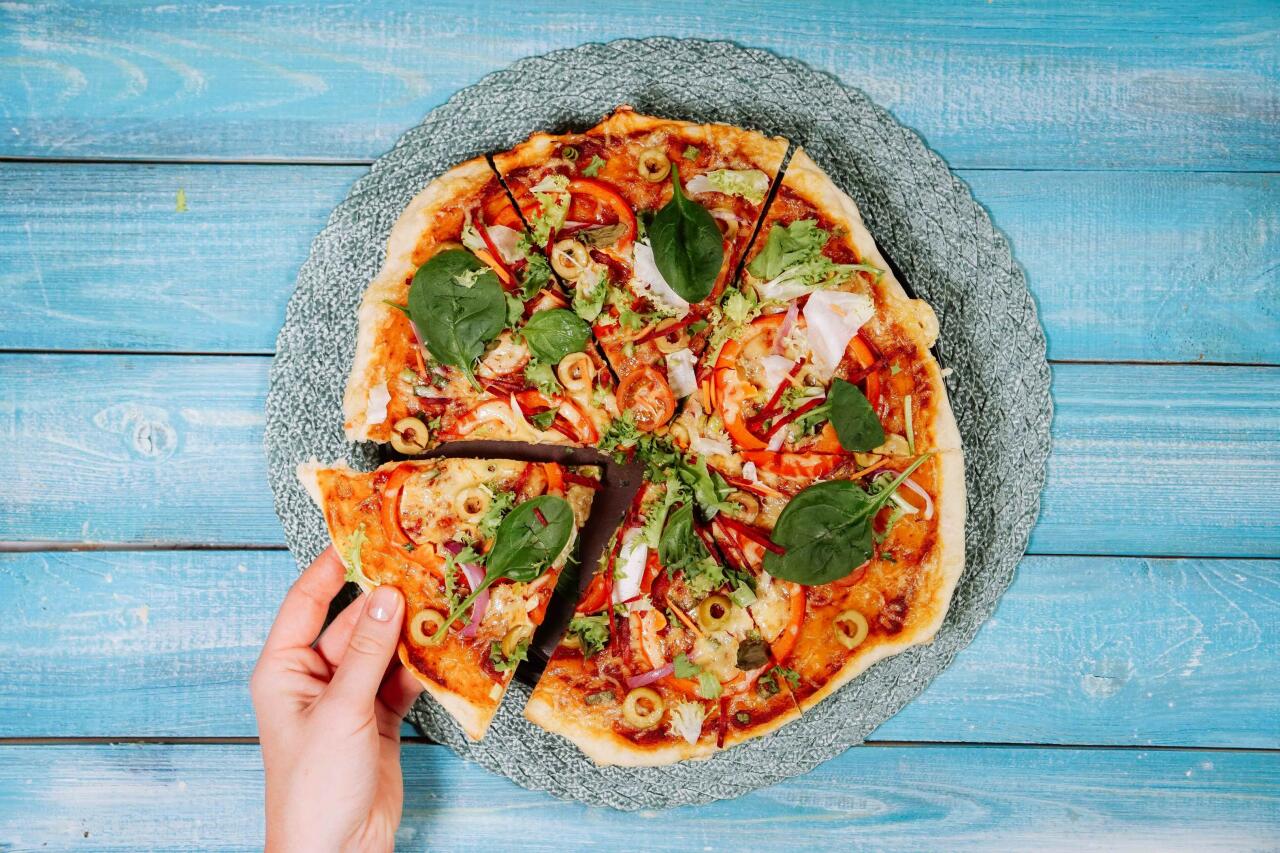 Приготовление: смешайте муку с солью и крахмалом, влейте воду, 2 ст.л. оливкового масла, перемешайте ингредиенты, замесите однородное, не прилипающее к рукам тесто, оставьте на время. Для приготовления соуса измельчите в блендере помидоры, чеснок, соль и перец. Нарежьте овощи ломтиками, натрите сыр, поджарьте луковицу и нарежьте ее полукольцами. Разогрейте духовку. Смажьте противень маслом, выложите тесто, растяните на противне руками. Смажьте тесто маслом, затем соусом, посыпьте паприкой, выложите на тесто лук, перец, помидоры, оливки, сверху посыпьте сыром и травами. Поставьте на 15-20 минут в духовку.