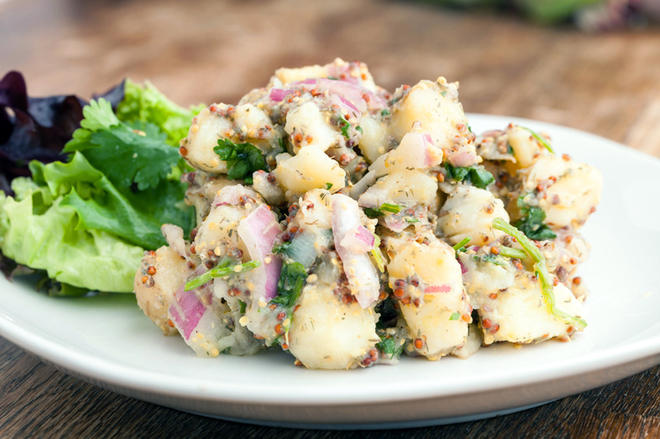 Попробуй картофельный салат с пряным вкусом и неповторимым ароматом. Нейтральный вкус картофеля прекрасно гармонирует с яркими и сочными вкраплениями маслин и каперсов. А завершает вкусовой букет насыщенная горчично-медовая заправка.