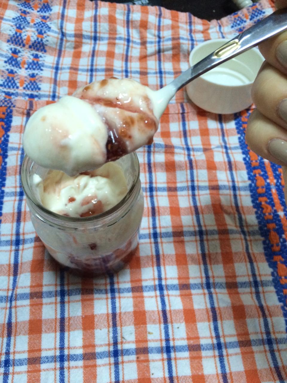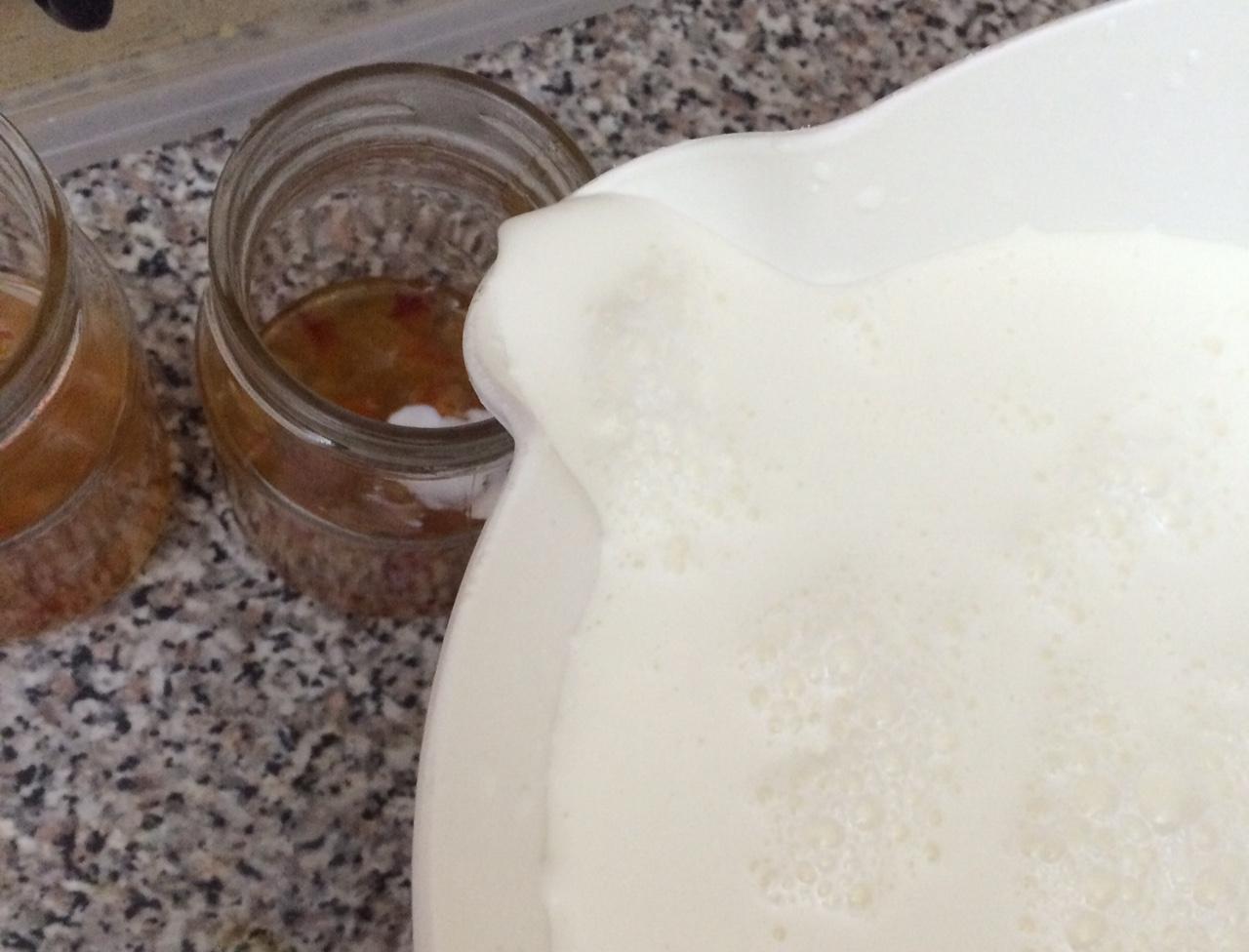 Если вы готовите сладкий йогурт, положите на дно баночки ложку любимого конфитюра и сверху аккуратно наливаем молоко с закваской.