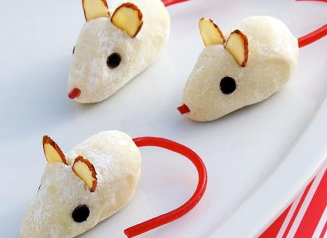 Заверните мышей в сахарную глазурь и поместите их в лоток. Работая с одной мышью, используйте кончик зубочистки, чтобы сделать отверстия в трюфельных конфетах, где расположен нос и хвост. Затем вставьте надрезанные стрючки солодки для носа, а также более длинные стрючки для хвоста. Вставьте два мини-шоколадных чипса вместо трюфелей для глаз. Для ушей, аккуратно вставьте два куска колотого миндаля в верхней части головы. Охладите мышей перед подачей.