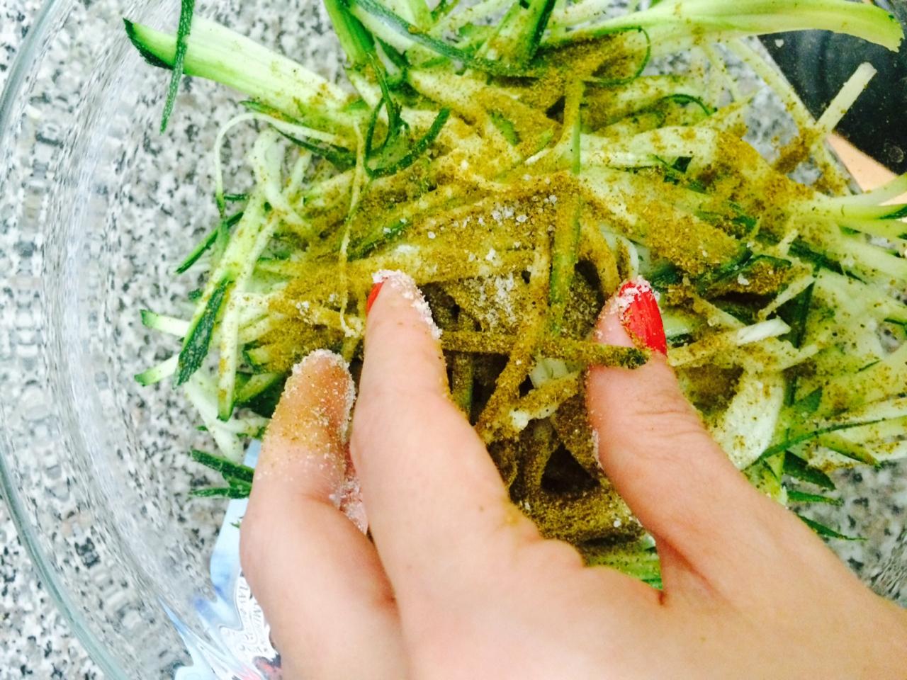 Нарезаем цукини тонкими полосками. как показано на фото, сбрызгиваем лимонным соком и посыпаем приправами.