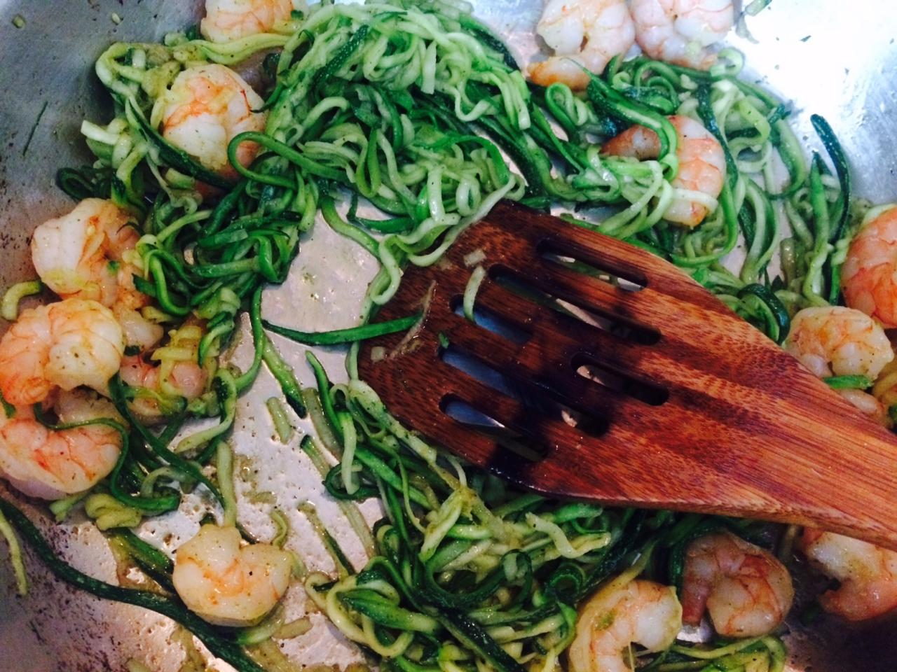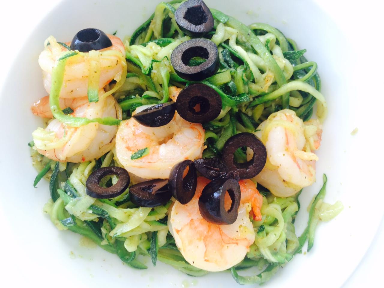 Одно из самых простых и полезных блюд - спагетти из цукини, отлично подойдет тем, кто уже задумался о весне и весе. Это эффектное блюдо может понравится и тем, кто не особо заботится о похудании, но выступает за правильное питание и здоровый образ жизни. Все что необходимо для этого, по большому счету, теплого салата - это или специальный нож, который легко превратит цукини в аккуратные длинные полосы, или просто хорошее владение самым обычным ножом и терпение. Все очень просто, главное помнить, что блюдо вариабельно и основные ингредиенты можно заменить к примеру кабачком и кальмаром или обычным баклажаном и куриной грудкой (но в этом случае куриная грудка будет готовится немного дольше чем креветки).