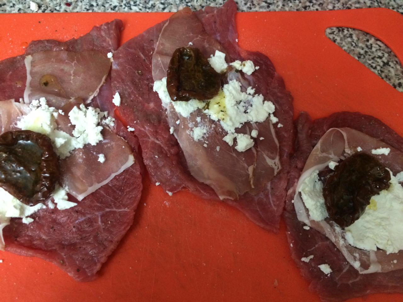 Укладываем на мясо тонкие ломтики прошутто, кусочки сыра фета (половинки кубика будет достаточно) и по одному вяленому томату.