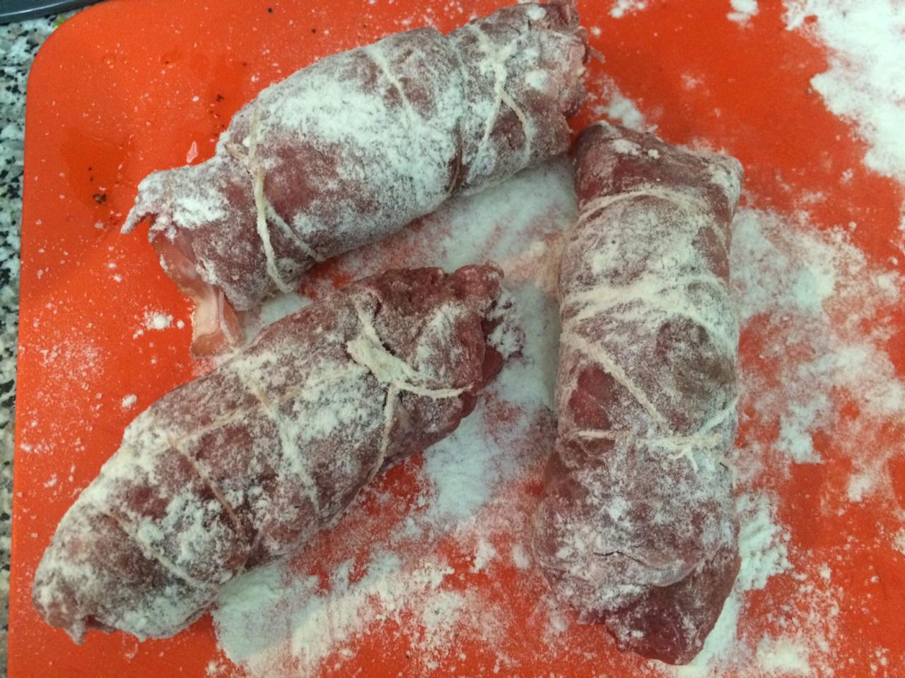 Сворачиваем мясо в рулетики и обвязываем кулинарной нитью. Присыпаем мукой и обжариваем на оливковом масле до золотистой корочки.