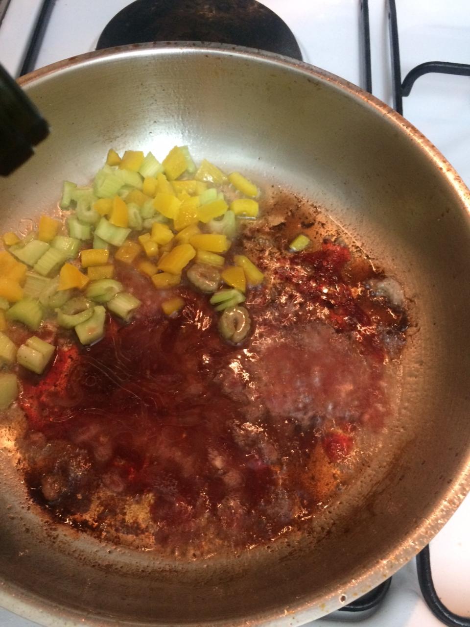 Перекладываем рулетики на тарелку и в той же сковороде готовим соус. Обжариваем на оставшемся масле нарежанные кубиком овощи и раздавленный чеснок, вливаем вино, даем алкоголю выпариться, добавляем сливочное масло и томаты.