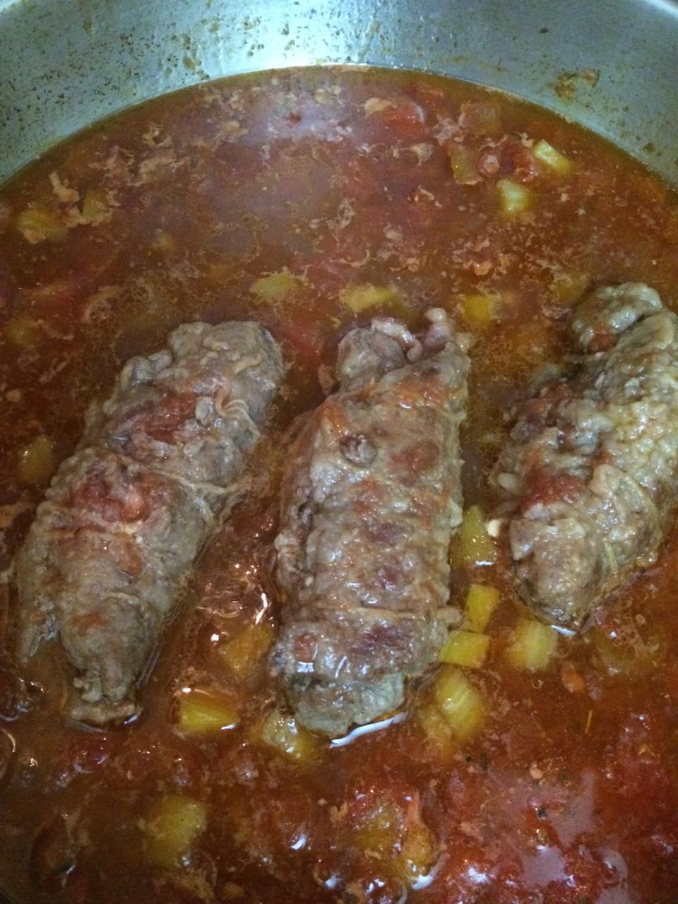 Приправляем по вкусу солью, перцем. если томаты кислые, можно добавить щепотку сахара, чтобы выравнять вкус и возвращаем рулетики обратно в сковороду, чтобы они потушились в соусе примерно час.