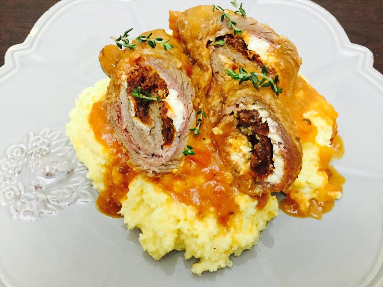 Итальянский ужин - рулетики из говядины с прошутто и вялеными томатами - это лишь идея. В тонкий отбитый кусочек говядины можно завернуть все, что угодно. Все равно получится вкусно, а главное сытно. Приготовление занимает совсем немного времени, правда на тушение в соусе уходит около часа, что совем не мешает приготовить рулетики накануне, а в будни просто подать их разогретыми с любым гарниром. Мы подавали с полентой, очень по-итальянски и главное быстро.