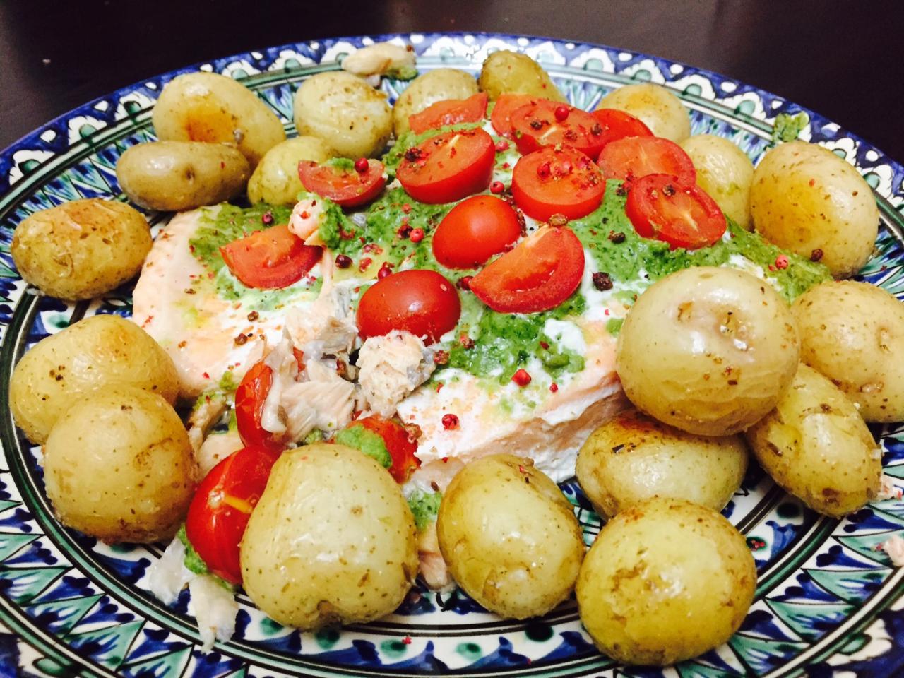 Лосось в весеннем исполнении - запеченный с соусом песто и томатами, дополненный молодой картошкой или хрустящей спаржей. Что может быть лучше для ужина с друзьями под бокал холодного белого? Предлагаем вам отличный вариант быстрого и вкусного ужина, достойного приема гостей! Сейчас как раз сезон зеленого базилика. И обязательно используйте розовый перец - это волшебная специя!