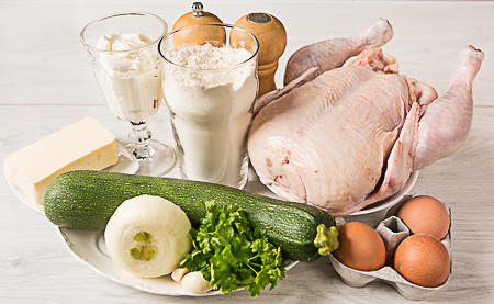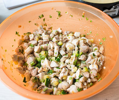 Готовим начинку. С курицы срезаем мясо и нарезаем его кубиками со стороной около 1-1,5 см. Так же режем лук и кабачок.