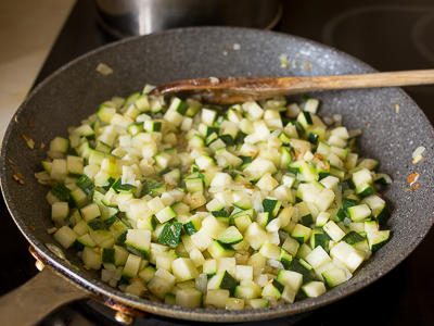 В сковороде на среднем огне разогреваем 2 ст.л. растительного масла. Кладем лук и жарим, помешивая, 3-4 минуты. Добавляем цуккини и жарим, помешивая, еще около 5 минут.