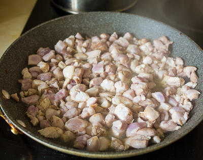 Увеличиваем нагрев до сильного и добавляем немного масла. В несколько заходов обжариваем курятину, примерно по 2-3 минуты на заход.