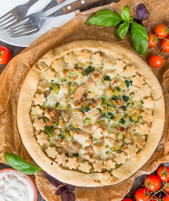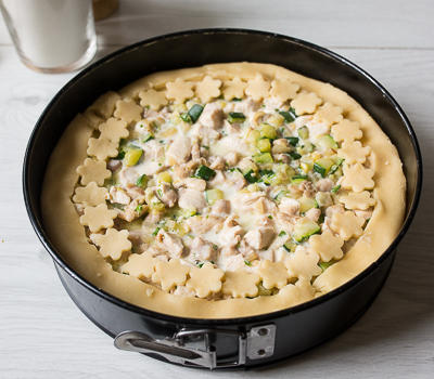 Если начинки не доходит до края бортика из теста, загибаем излишки на начинку. Из оставшихся обрезков можно вырезать фигурной формочкой декор, как это сделала я.