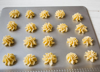 Перекладываем тесто в мешок с насадкой-звездочкой. Отсаживаем на противень печенье.