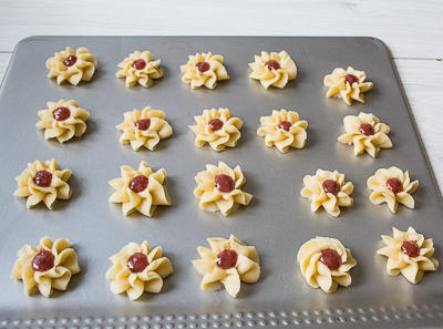 В центре каждого делаем небольшое углубление и отсаживаем в него джем.