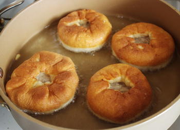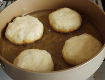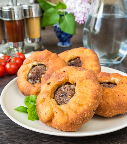 Разогреваем масло на среднем огне (если есть спец. термометр - температура должна быть около 160 градусов). Кладем беляши сначала дыркой вниз и жарим, пока они хорошо не зарумянятся.