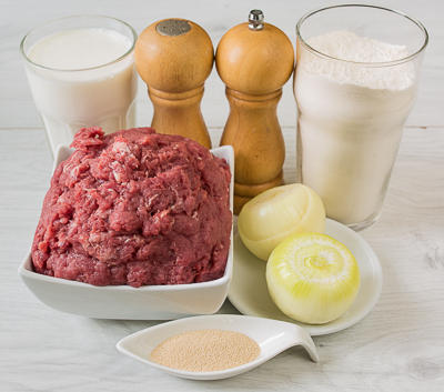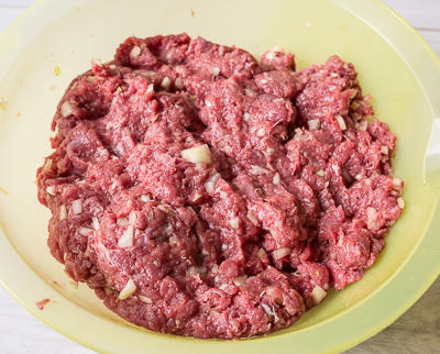 Пока подходит тесто, готовим начинку. Лук мелко рубим, смешиваем с фаршем. Солим и перчим по вкусу. Хорошо вымешиваем.