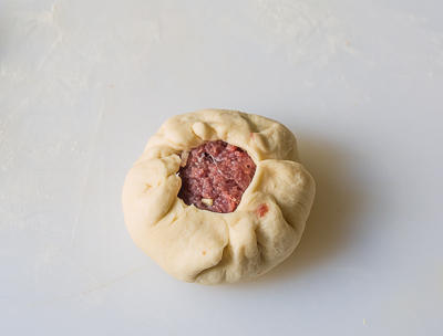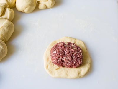 Обминаем подошедшее тесто и начинаем формовать беляши. От большого куска отделяем кусочки размером с мандарин, раскатываем на присыпанной мукой или смазанной маслом поверхности в лепешки толщиной примерно 0,3-0,5 см. На середину каждой лепешки кладем фарш.
