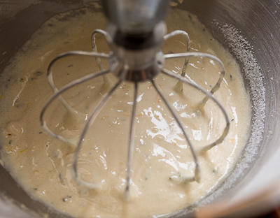 В яичную смесь добавляем цедру, чай, а также просеянную с разрыхлителем и солью муку. Замешиваем тесто.