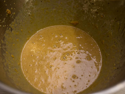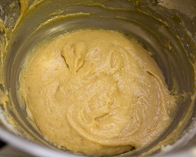Банан перемалываем блендером. Добавляем яйцо, сахар, кефир, арахисовое и растительное масло. Перемешиваем венчиком до однородного состояния.