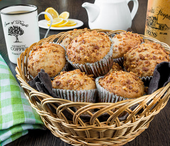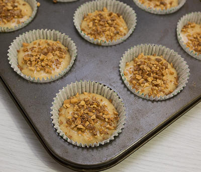 Раскладываем тесто по формочкам (если не используете бумажные вкладыши - смажьте формы маслом). Посыпаем пралине.