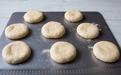 Готовое тесто обминаем и делим на 8 частей. Из каждой формируем шар и придавливаем его ладонью. Кладем на противень.