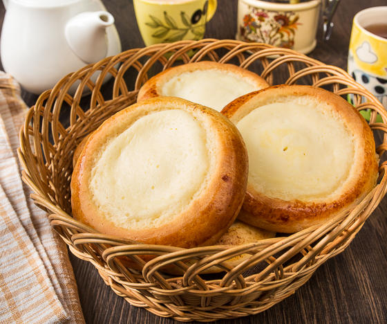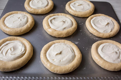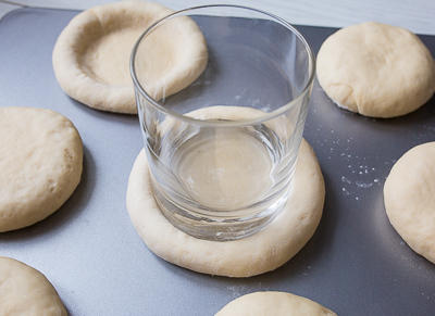 Даем булочкам расстояться еще минут 40, предварительно накрыв полотенцем. В центр каждой расстоявшейся булочки ставим стакан и придавливаем, чтобы получилась выемка под начинку.