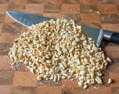 Пока охлаждается тесто, поджариваем арахис - на сковороде или в духовке (5-7 минут при 200 градусах). Рубим не очень мелко ножом.