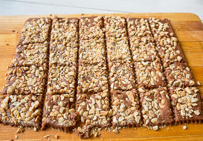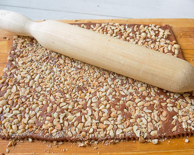 Сверху кладем арахис (часть оставляем, чтобы раскатать и посыпать обрезки) и прокатываем скалкой.