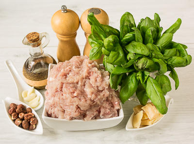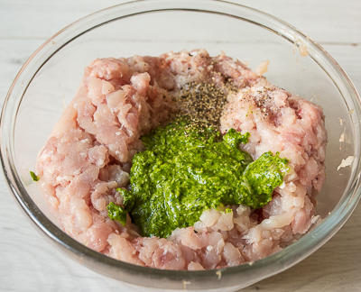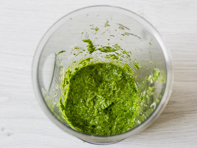 Ингредиенты для песто кладем в стакан и перебиваем блендером.