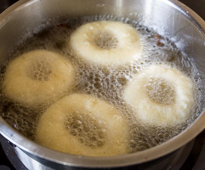 Жарим пончики в разогретом масле (они должны плавать). По нагреву. На электрической плите я жарю на 8 делении нагрева из 9. Если готовить по термометру - то ориентируемся на 150-160 градусов.