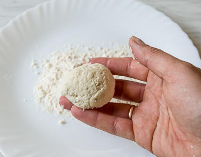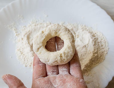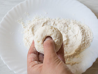 Обваливаем в муке. Берем шарик в руку и продавливаем большим и указательным пальцами сквозную дырку в центре.