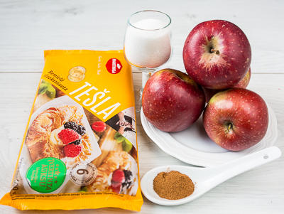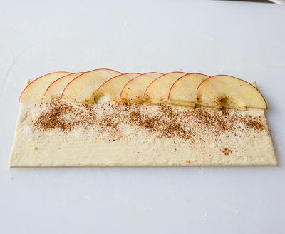Один лист теста (ширина - около 10-13 см) смазываем сливочным маслом. По верхнему краю кладем яблоки. Присыпаем сахаром и корицей.
