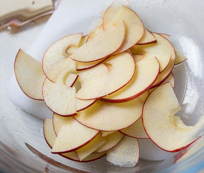 Яблоки разрезаем пополам, вырезаем сердцевинки. Кожу не счищаем. Нарезаем на тонкие ломтики, кладем в миску, поливаем лимонным соком и перемешиваем.