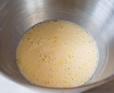 Дрожжи растворяем в теплом молоке. Добавляем все остальные ингредиенты, кроме муки, и смешиваем венчиком до более-менее однородного состояния.