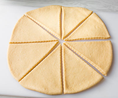 Подошедшее тесто обминаем и делим пополам. Каждую половину раскатываем в круг и разрезаем на 8 секторов.
