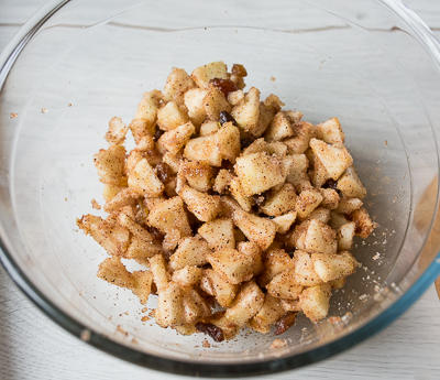 Для начинки яблоки чистим от кожуры, удаляем сердцевинки. Мякоть нарезаем на небольшие кусочки, смешиваем с корицей, сахаром и изюмом.