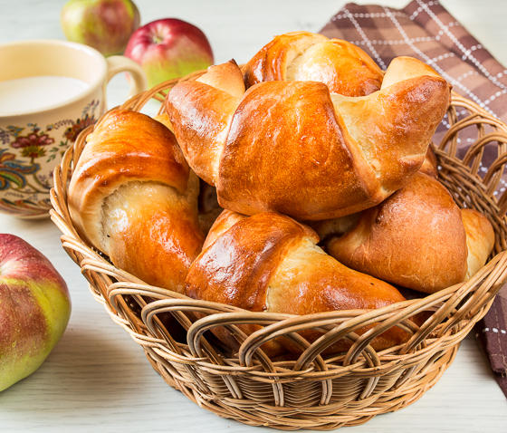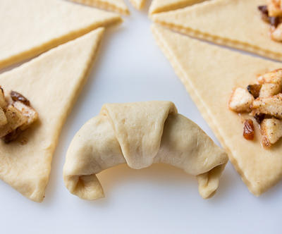 Кладем рогалики на противень и даем подойти в течение 20-30 минут. Затем смазываем взбитым яйцом и отправляем в предварительно разогретую до 200 градусов духовку и выпекаем до готовности и румяной корочки, около 15-20 минут.