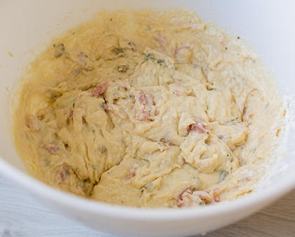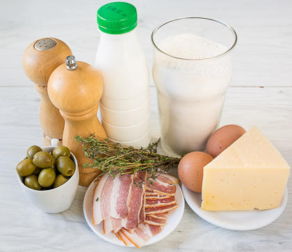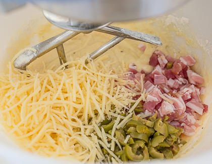 Добавляем мекло нарезанные оливки и бекон, а также натертый сыр. Туда же кладем листики, оборванные с веточек тимьяна.