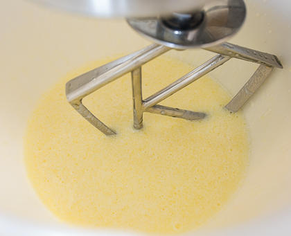 Растапливаем масло и даем ему 5 минут остыть. Выливаем в чашу, добавляем яйца, сахар и кефир, взбиваем до однородного состояния.