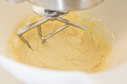 Добавляем просеянную с солью, содой и разрыхлителем муку и перемешиваем.